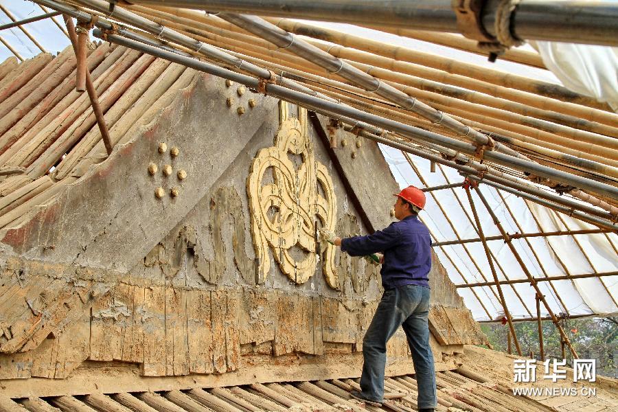 A construction worker is refurbishing the wall of the Hall of the Heavenly Kings of Longxing Monastery in Zhengding of North China’s Hebei province on April 14, 2014. [Photo/Xinhua]