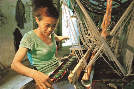 A weaver operates a "primitive" loom nicknamed "the pig basket".(photo:China Daily)