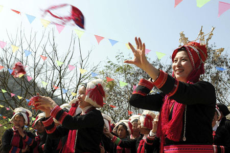 Girls of the Yao ethnic group cast earthbags to celebrate the Chinese New Year in Wei'e Yao Ethnic Group Village in Leli Township of Tianlin County, south China's Guangxi Zhuang Autonomous Region, Feb. 17, 2013. People here follow a tradition to cast earthbags to celebrate the Chinese New Year.