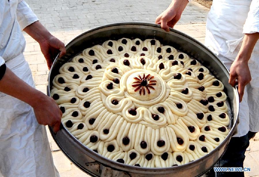 Workers make flowery buns in Zhengzhou, capital of center China's Henan province, Jan. 28, 2014. Many folk traditions, such as sticking paper cuts and making flowery buns, were displayed at a folk temple fair in Zhengzhou to celebrate the upcoming Spring Festival. (Xinhua/Li An)
