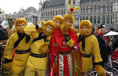Performers take part in the Chinese New Year Parade in Brussels, Belgium, Feb 6, 2016.