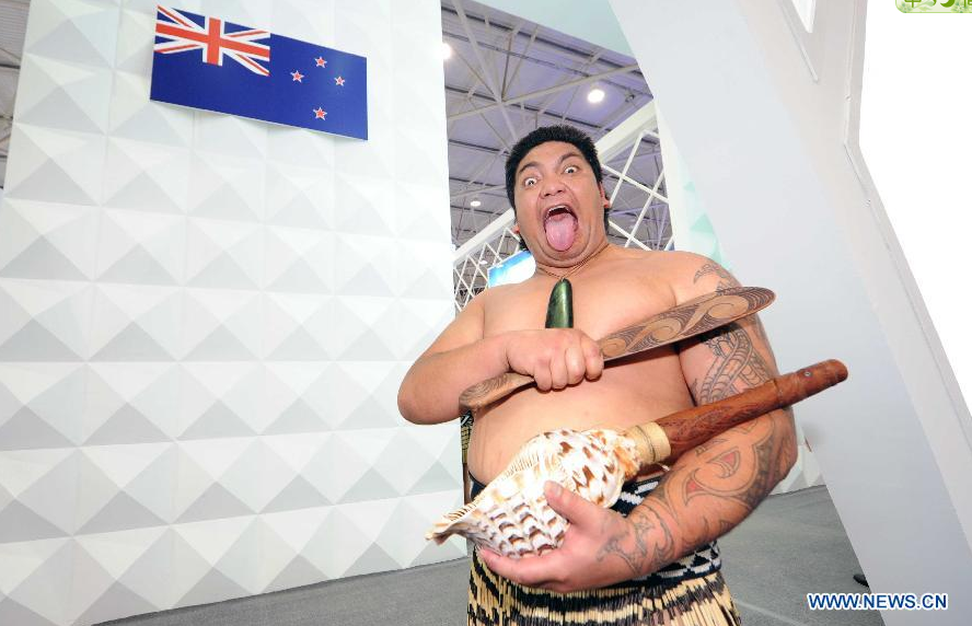 An exhibitor from New Zealand makes face during the 3rd China (Guizhou) International Alcoholic Beverage Expo in Guiyang, capital of southwest China's Guizhou Province, Sept. 9, 2013. The four-day expo kicked off on Monday. (Xinhua/Yang Ying) |