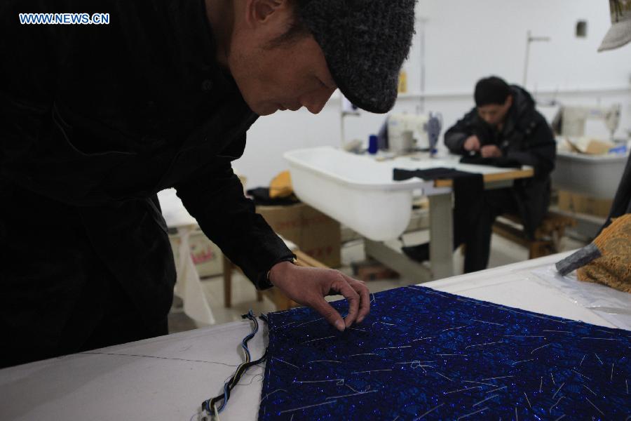 Designer Laurence Xu checks an unfinished bespoke dress at his studio in Beijing, capital of China, Feb. 17, 2014. Xu, a Shandong, China-born, Paris-based designer, will show his new creations at the Paris fashion week in July. (Xinhua/Liu Changlong) |
