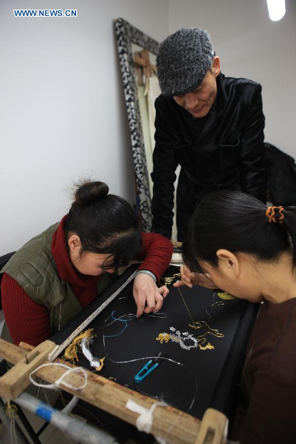 Designer Laurence Xu (C) checks the making of an embroidery at his studio in Beijing, capital of China, Feb. 17, 2014. Xu, a Shandong, China-born, Paris-based designer, will show his new creations at the Paris fashion week in July. (Xinhua/Liu Changlong) |