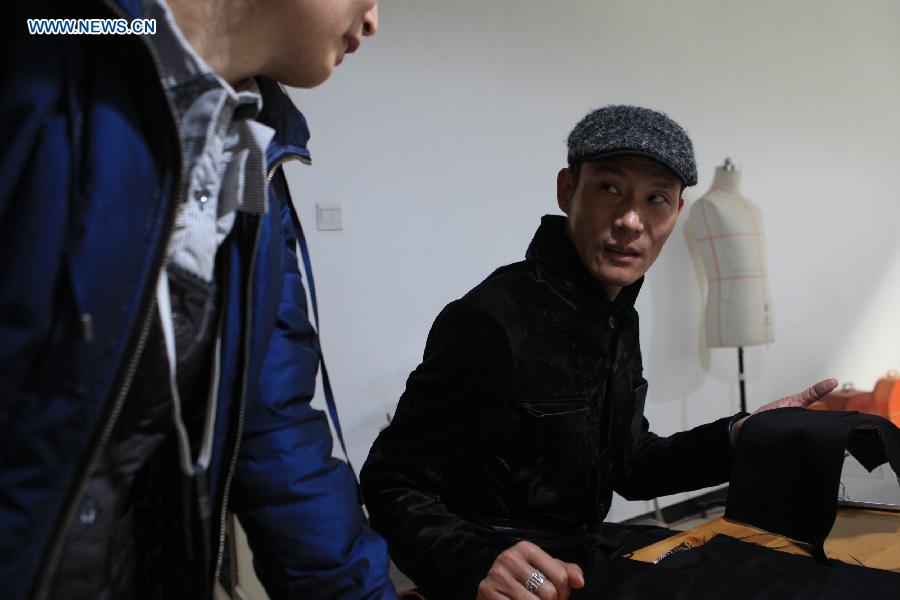 Designer Laurence Xu discusses with a seamstress about his creations in Beijing, capital of China, Feb. 16, 2014. Xu, a Shandong, China-born, Paris-based designer, will show his new creations at the Paris fashion week in July. (Xinhua/Liu Changlong)