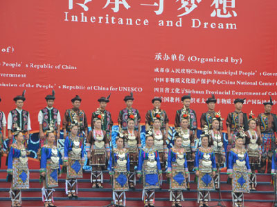 Actors give performances of Sheepskin Drum at the opening ceremony of the 4th International Festival of Intangible Cultural Heritage in Chengdu.