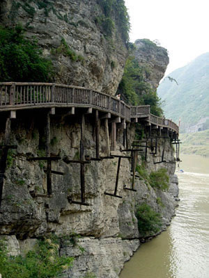 自此之后,人們便世世代代在此基礎(chǔ)上奮力開鑿,將蜀道一次次延伸、拓寬,印證著人類征服自然天險(xiǎn)的堅(jiān)定決心。僅以朝天峽為例,這里地勢(shì)險(xiǎn)峻,又是通向巴蜀的必經(jīng)之地,古往今來,人們?yōu)榱舜蛲ㄊ竦溃群笤谶@里修建了6條難度極高的道路,因此,這里又有“中國交通史博物館”的美譽(yù)。這6條道路分別是:遠(yuǎn)古時(shí)候山民們走出的羊腸小道、先秦時(shí)官府倡導(dǎo)在峽壁建立的棧道、峽中江邊船工們修建的纖夫道、嘉陵江上的船道、民國時(shí)期修建的川陜公路以及上世紀(jì)50年代修建的寶成鐵路隧道。