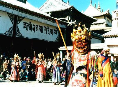 無(wú)論是羌姆還是藏戲在使用面具時(shí)有一定的規(guī)制。藏族全民信教,對(duì)神佛無(wú)限虔誠(chéng),擬神仿佛的面具,在他們心目中決不是單純的實(shí)體,依然是宗教中“法王”、“護(hù)法神”、“金剛”等神或佛的金身玉體。因此,對(duì)面具的尊崇即是對(duì)神靈的敬重,特別是對(duì)“忿怒相”、“威猛相”等足以威懾邪魔惡鬼的面具,更予崇敬。每次表演羌姆、藏戲取用面具時(shí),總是先誦經(jīng)文后取用,用畢,再誦經(jīng)文方可入箱(或懸掛)珍藏,這是藏傳佛教各大小寺院取用面具必須遵循的儀軌。
