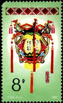 1985年2月28日,我國郵政發(fā)行T104《花燈》特種郵票一套4枚。郵票圖案選用中國當代民間工藝大師制作的“九蓮獻瑞”(浙江杭州)、“龍鳳呈祥”(廣東佛山)、“百花齊放”(廣東廣州)、“金玉滿堂”(上海)圖樣。它繼承傳統(tǒng)而又有創(chuàng)新,構思巧妙、匠心獨運。其中的“金玉滿堂”也就是金魚燈,出自上海已故“江南燈王”何克明之手,由金魚和蓮花、荷葉、藕的形象結構而成,造型生動活潑,寓意連年有余,象征豐收。