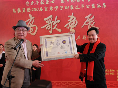 2010年北京的冬天,比以往幾年似乎都更寒冷。當(dāng)華燈初上闔家團(tuán)圓時(shí),有一些貧寒的學(xué)子,卻僅僅因?yàn)榧邑?,就回不了家,過不了年,這是多么讓人感傷的一件事。為此高歌決定,自己虎年的第一個(gè)畫展,所有與“高檔”有關(guān)的環(huán)節(jié),全部削弱,節(jié)約下來的經(jīng)費(fèi),將資助那些因家貧不能回家過年的大學(xué)生們。