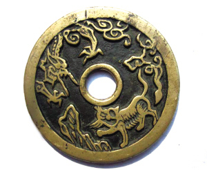 虎的圖案在我國古代生肖錢幣上較為常見。生肖文化是我國勞動人民智慧的結晶,鑄有生肖圖案或文字的生肖錢幣是生肖文化的重要組成部分。生肖錢唐代即有鑄造,距今已有1300多年的歷史。它以十二生肖屬相作為題材,故名?;⒃谑ぶ信旁诘谌?,與地支中的“寅”相對,甲骨文中就有的“寅”字,恰如一頭迎面而來的猛虎。歷代鑄造的生肖錢幣上生肖寅虎自然是不可或缺的主題圖案之一。現(xiàn)今流傳下來的生肖虎錢有單枚成套的,正面為生肖虎的造型圖案,穿上為地支文字“寅”,錢背沒有任何文字或圖案,或有“寅”、“寅生”字樣,或有一符篆文字,或出現(xiàn)本命星官的圖案;也有將包括虎在內(nèi)十二生肖合鑄于一錢的。生肖虎錢品種眾多,不勝枚舉。