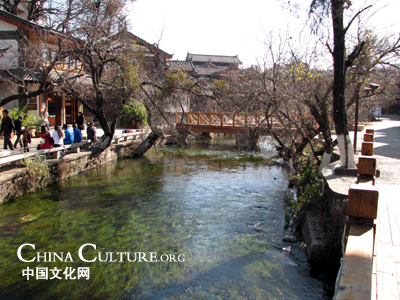 這里的民居多是臨溪而建,清流的小溪分散在小巷窄街,寬的1米多,窄的甚至可以一步跨過。古城的泉水富有音韻,穿街走巷,入院過墻,流遍萬戶千家。小溪的長流不息為古城增添了水的靈氣與生機(jī),小溪邊裝修別致的酒吧、茶樓、連接河岸的木板橋,形成了古城獨有的水鄉(xiāng)風(fēng)景。
