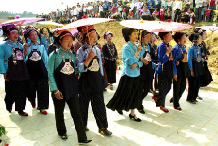 節(jié)日是選在有高大木棉樹的地方過的。男女青年們從四面八方云集而來。他們穿著民族盛裝,懷揣五色糯飯、糍粑或粽子等食品,帶上為情人而備的頭巾、千針底新鞋等禮品,尤其不能少了精心繡制的繡球。人倦綠叢中三五成群,對唱山歌,贊情侶,夸對方,求連情,同時歌頌百花仙子的佳潔、美麗。唱到情深意醉,繡球便帶著無限的柔情,象彩虹一樣飛向自己的心上人。一時在綠叢中彩球飛舞,給歌場增添了無限的趣意。