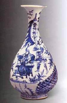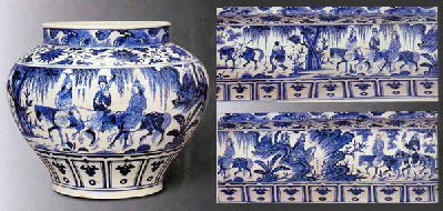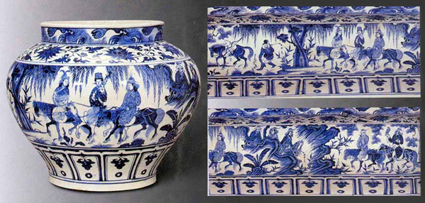 流失在海外的,以現(xiàn)藏于日本出光美術(shù)館的“昭君出塞”圖青花蓋罐最為出色。這件蓋罐的形制、構(gòu)圖形式與廣西橫縣出土的“單騎救主”圖蓋罐極為相似。罐腹繪九個(gè)人物,七匹乘騎(另外兩騎當(dāng)隱在山石后面)。九個(gè)人物中有男有女,有老有少,或騎在馬上,或搖鞭步行。馬上馱著弓弢、行囊。觀人物相貌、服飾有差別。其中騎在一匹白馬之上,懷抱琵琶,梳高髻的漢裝女子是王昭君,前后各有一胡服女子隨行。六名男子中,有的頭戴貂冠,髡發(fā)駕鷹,著胡服;有的戴氈笠,著漢裝。當(dāng)是迎親的匈奴使節(jié)和漢朝送親的官員。畫面中山石掩映,蒼松、翠柳、修竹、芭蕉雜襯其間。疏密有致,布局勻當(dāng)。