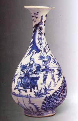 “蒙恬將軍”玉壺春梅瓶出土于湖南常德市,現(xiàn)藏于湖南省博物館。玉壺春瓶為酒壺的一種,古代糧食酒常冬天釀造,春天飲用,故多以“春”為名。畫面中蒙恬頂盔貫甲,面相威嚴(yán),端坐在椅上。其后一武士披甲懸劍,雙手握一桿大旗,旗上直行書“蒙恬將軍”四大字。蒙恬的前方一名高鼻深目,手持彎弓的武士前來(lái)稟告。武士的身后一頭戴氈笠,短衣束帶的士卒右手按一抓來(lái)的官吏,此人戴高冠,著花袍,作漢人裝束,跪伏于地。整個(gè)畫面繪蒙恬將軍審訊戰(zhàn)俘的場(chǎng)景。蒙恬滿面鋼髯,端然穩(wěn)坐的姿態(tài),以及背后高高樹(shù)起的大旗,展示了巍然肅殺之氣。