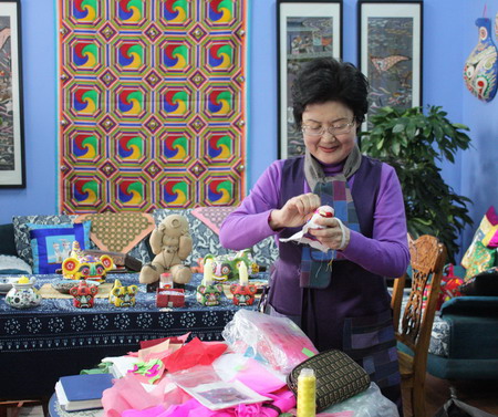 我從外面一回來只要一進(jìn)屋就做這個(gè)活,我的先生孩子就會(huì)知道我今天在外面有生氣的事了??吹竭@個(gè)五彩的布,腦子里就只有這一件事情了,沒有煩惱的事了。所以我一直提倡老年人做這個(gè),特別好,這樣就根本沒有想法來怪兒媳婦啊兒子啊不對(duì)了。