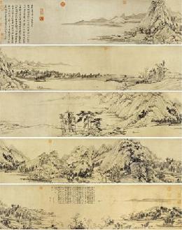 此畫卷為六接的紙本,即是由六張紙連成的畫卷.黃公望(字子久)為元代最負盛名的畫師,在畫史上的影響頗大。他在《山水訣》中,明確提到模寫。他說:“皮袋中置描筆在內(nèi),或于好景處,見樹有怪異,便當模寫之。”子久作品存世不多,其中最佳者當屬《富春山居圖》。為了創(chuàng)作《富春山居圖》,他在“領略江山釣灘之勝”時,“袖攜紙筆,凡遇景物,輟即模記”。此畫成于至正七年(1347年),此時子久年近八旬,畫中所題文字表明,他為完成此畫而潛心觀察、揣摩費時三四年。張庚在《圖畫精意識》中記載了董其昌對此畫的贊譽,“子久畫冠元四家……如富春山卷,其神韻超逸,體備眾法,脫化渾融,不落畦徑?!?/p>