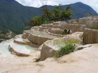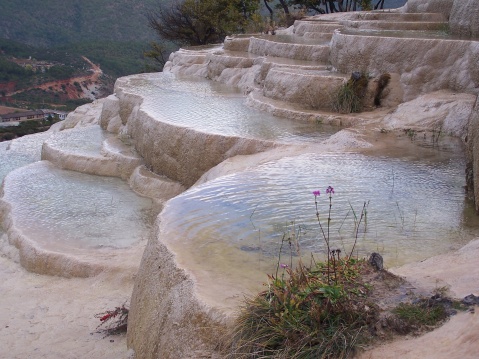 位于香格里拉縣城東南的三壩鄉(xiāng)白地村,是納西族東巴教的發(fā)祥地。遠(yuǎn)處看去,青山掩映中的白水臺造型真的就像層層梯田,在陽光照耀下,又仿若攝影作品中凝固的瀑布一般。一腳踏在白色的石階上,說不出的泌涼暢快。