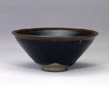 要使湯色純白,湯花咬盞,除了茶品要新,用水要活,器具的選用也是一門學(xué)問。宋朝任福建漕司(監(jiān)制貢茶事)的蔡襄在奉旨修撰的《茶錄》一書中,對(duì)黑瓷兔毫盞同品茶、斗茶的關(guān)系說得很明確:“茶色白,宜黑盞”,因?yàn)椤岸凡柘榷飞倍枭F白、青白者受水昏重。蔡襄又云 “建安所造者紺黑,紋如兔毫,其坯微厚,最為要用。出他處者,火薄或色紫,皆不及也。其青白盞,斗試家之不用”,宋徽宗也曾說:“盞以青綠為貴,兔毫為上?!碧K軾《送南屏謙師》詩又曰:“道人曉出南屏山,來試點(diǎn)茶三味手。忽驚午盞兔毫斑,打作春甕鵝兒酒”。這些詩句都說明在適宜斗茶的黑盞中,兔毫盞是最為合適、頗為名貴的一種。這種盞的釉內(nèi)含有豐富的鐵,燒制的過程中,含鐵的釉順勢(shì)融化垂下,一絲一絲拉長(zhǎng)變細(xì),如同兔毛,當(dāng)年許多日本人來到浙江天目山進(jìn)修,將黑釉兔毫盞由天目山帶回日本,從此統(tǒng)稱為“天目盞”,供之如國寶,極為珍視。