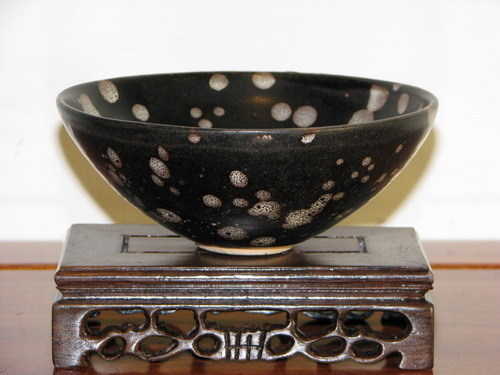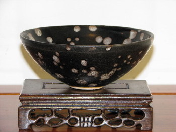 還有另一種杯盞叫做鷓鴣斑。據(jù)北宋陶《清異錄》記載:“閩中造盞,花紋鷓鴣斑點(diǎn),試茶家珍之”。鷓鴣斑就像鷓鴣鳥羽毛,頸上、背上、胸和腹部顯著的云狀和塊狀斑點(diǎn),呈紫、藍(lán)、粉青、黃、暗綠,諸色相雜,猶如節(jié)日夜空的禮花五彩繽紛。鷓鴣斑用含鐵量很高的不同的兩種紫金土來(lái)配制黑釉,使釉內(nèi)含鐵量高達(dá)6—8%,黑如漆,再在生坯上掛釉兩次,以稍低于燒制其他結(jié)晶釉的溫度焙燒,因較多的鐵元素在釉里結(jié)晶,黑色釉面便形成了酷似鷓鴣羽毛一樣盡善盡美的花紋,故名“鷓鴣斑”。又因?yàn)樯幊烈脖环Q為“鬼臉?biāo){”。宋作者黃庭堅(jiān)詞中也曾吟詠道:“纖纖捧,研膏濺乳,金縷鷓鴣斑?!痹~中是說(shuō)紅巾翠袖,纖纖玉指,研茶沏水,捧精美金縷鷓鴣斑茶盞,侍奉身前,堪稱一時(shí)雅事。以其紋色“金縷鷓鴣斑”代指“鷓鴣斑”茶盞。可見“鷓鴣斑”茶盞極珍貴。反映了宋代人飲茶不僅要有好茶葉之外,還要有好水,好茶具,好的捧盞人,這才是品茶之道。