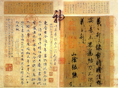 《快雪時晴帖》是“書圣”王羲之當今存世的唯一書法精品真跡??v23cm;橫14.8cm,行書四行,二十八字?!犊煅r晴帖》是一封書札,其內(nèi)容是作者寫他在大雪初晴時的愉快心情及對親人的問候。
