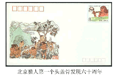 1989年我國發(fā)行了JF24《紀(jì)念北京猿人批一個(gè)頭蓋骨發(fā)現(xiàn)六十周年》紀(jì)念郵資信封,郵資圖為頭蓋骨和猿人復(fù)原圖,信封圖案是北京猿人生活圖;1991年發(fā)行了《第十三屆國際第四紀(jì)研究聯(lián)合大會(huì)》郵票,畫案是猛犸象和中國猿人復(fù)原圖。