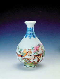 它的造型是由唐代寺院里的凈水瓶演變而來(lái)?;拘沃茷槠部?、細(xì)頸、垂腹、圈足。它是一種以變化柔和的弧線為輪廓線的瓶類。其造型上的獨(dú)特之處是:頸較細(xì),頸部中央微微收束,頸部向下逐漸加寬過(guò)渡為杏圓狀下垂腹,曲線變化圓緩;圈足相對(duì)較大,或內(nèi)斂或外撇。這種瓶的造型定型于宋代,歷經(jīng)宋、元、明、清、民國(guó)直至現(xiàn)代,成為中國(guó)瓷器造型中的一種典型器物。
