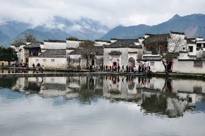 南湖位于宏村南首,建于明萬(wàn)歷丁未年(1607年),宏村村落經(jīng)永樂(lè)年間到萬(wàn)歷年間,樓舍連棟,高低錯(cuò)落,人口繁衍,光靠月塘蓄水已不夠用,又在萬(wàn)歷年丁末年將村南百畝良田,鑿深數(shù)丈,周圍四旁砌石立岸,仿西湖平湖秋月式樣,建成南湖。湖成大弓形,湖堤分上下層,上層寬4米,原來(lái)古樹參天,蒼翠欲滴,軀干青藤盤繞,禽鳥鳴唱,還有垂柳,枝葉婀娜,像臨鏡梳妝的少女,把秀發(fā)灑向湖面水中。湖面綠荷搖曳,鴨群戲水,另有一番景致。整個(gè)湖面倒影浮光,水天一色,遠(yuǎn)峰近宅,跌落湖中,加之樹蔭水深和日光的相互作用,明暗協(xié)調(diào),動(dòng)靜相宜,顯得幽深、雅靜、清新、明麗。南湖歷史上大修三次,1986年重建中堤,造"畫橋"可東西劃舟,情趣無(wú)窮。