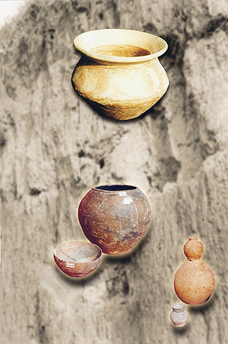 Gourd-shaped pottery bottle: container (bottom-right); Pottery jar: