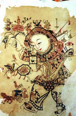 The characters' countenances and attires are painted in lead powder in golden