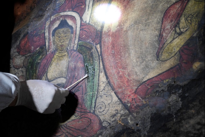 Even during the scorching summer, the team of seven had to wear layers of thick clothes and knee pads to stay warm in a freezing and damp grotto. The dark space is dimly illuminated by their headlights and is home to wall paintings dating back hundreds of years.