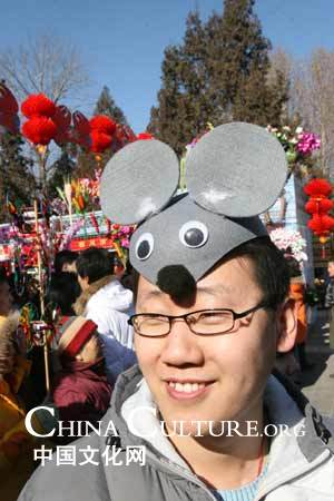 A young man takes a stroll with special fashion accessory at a temple fair in Beijing, capital of China, Feb. 7, 2008. Local citizens wear various fashion accessories, which help bring out the festival atmosphere, to attend Beijing traditional temple fairs on the first day of the Chinese Spring Festival.