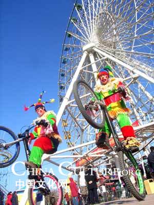 Two buffoons show cycling skills on the temple fair in the Shijingshan Amusement Park in Beijing, capital of China, Feb. 7, 2008. A temple fair featuring foreign customs and food was kicked off here on the first day of the traditional Chinese Spring Festival.