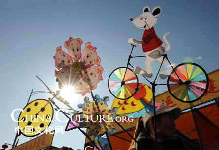 A vendor shows pinwheels with cartoon figures at the Changdian Temple Fair in Beijing, Feb. 7, 2008, the first day of the Spring Festival. The Changdian Temple Fair, held during the Spring Festival holidays, has a history of more than 400 years.