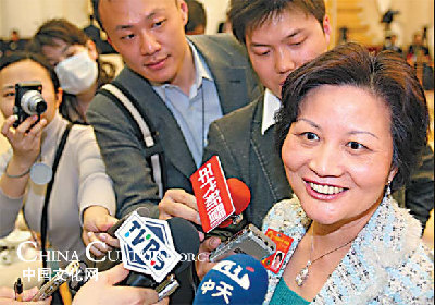 NPC deputy Chen Yunying, wife of Lin Yifu, the World Bank's chief economist-designate, is interviewed yesterday in Beijing. Chen and other deputies from the Taiwan delegation reviewed the work reports of the top judge and prosecutor.