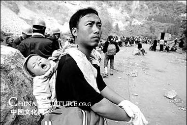 A baby cries as his father waits for a landslide to clear as he treks from the village of Qingping to Hanwang on Friday.