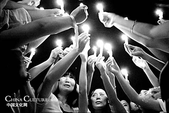 On Monday night residents in Jinan light candles to pray for earthquake victims.