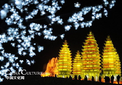 People look at giant ice sculptures at the Ice and Snow World Park in Harbin, northeast China's Heilongjiang Province January 5, 2009. Over 50 million yuan and 100,000 cubic meters of ice were consumed there for the sculptures of the 25th Harbin International Ice and Snow Festival which started on Monday. Harbin, the capital of Heilongjiang province, is one of the country's coldest places. Winter temperatures can drop to below -35 C. [Xinhua]