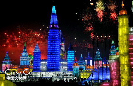 Fireworks go off in the sky at the Ice and Snow World Park in Harbin, capital city of northeast China's Heilongjiang Province January 5, 2009. Over 50 million yuan and 100,000 cubic meters of ice were consumed there for the sculptures during 25th Harbin International Ice and Snow Festival which started on Monday. [Xinhua]