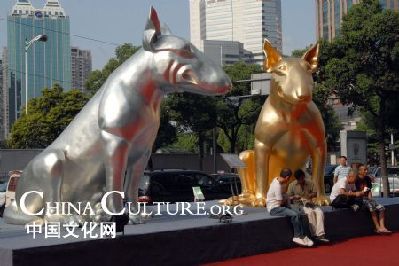 Some visitors take a break under the theme sculpture, known as This is Love, of the ongoing 13th Shanghai Art Fair, which opens at the Shanghai Mart, in Shanghai, east China, Sept. 9, 2009. Over 120 collection organizations from China and overseas, among them 96 from China, bring upon modern and contemporary artistic works in the categories of traditional Chinese paintings, oil paintings, block print, sculpture, porcelain and pottery, and etc. to participate in this rendezvous nicknamed as the vane of Asian art collections.