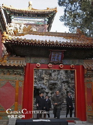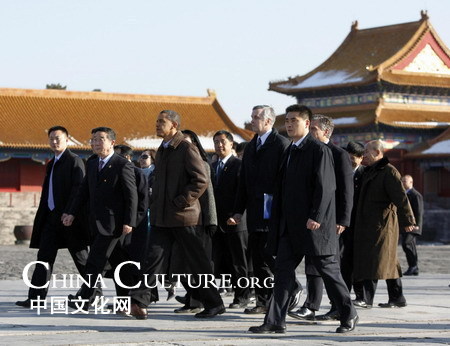 US President Barack Obama (C) tours the Forbidden City in Beijing November 17, 2009。
