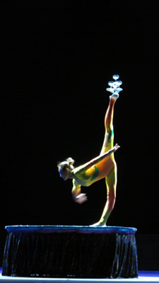 Zou Mo, a actor of the China Acrobatic Troupe, performs “Glasses balancing by one person”.
