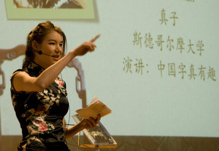 First prize winner of the university students group Aasa Wretman gives a Chinese speech during the "Chinese Bridge" Chinese language competition of Swedish middle school and university students in Stockholm, April 10, 2011. [Photo/Xinhua]