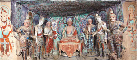 A high resolution digital photo of a niche with statues in Mogao Grottoes' No 45 cave, taken by the Apsara camera. [Photos by Sun Zhijun / For China Daily]