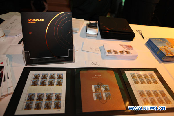Photo taken on Jan. 4, 2012 shows the stamps called Ancient Astronomical Instruments during the launching ceremony at the Tycho Brahe Planetarium in Copenhagen, Denmark. The series of two stamps, which were jointly issued by postal authorities of Denmark and China, feature the Abridged Armilla of the 13th century Chinese astronomer Guo Shoujing, and the armillary sphere of his 16th century Danish counterpart Tycho Brahe. [Xinhua/Wu Bo]