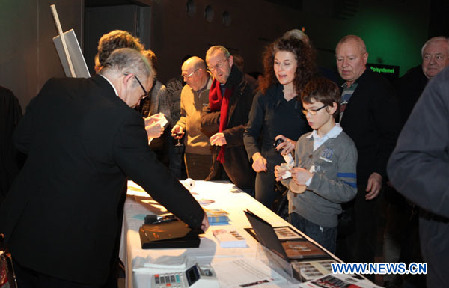 People buy the stamps called Ancient Astronomical Instruments during the launching ceremony at the Tycho Brahe Planetarium in Copenhagen, Denmark, on Jan. 4, 2012. The series of two stamps, which were jointly issued by postal authorities of Denmark and China, feature the Abridged Armilla of the 13th century Chinese astronomer Guo Shoujing, and the armillary sphere of his 16th century Danish counterpart Tycho Brahe. [Xinhua/Wu Bo]