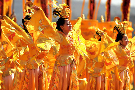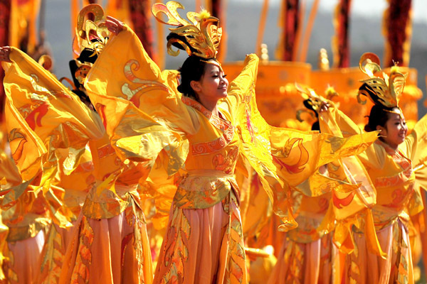 Dancers perform during a ceremony to honor Huangdi, the Yellow Emperor, in Huangling county of Northwest China's Shaanxi province on Wednesday. Huangdi, a legendary hero living about 5,000 years ago, is considered to be the ancestor of the Chinese nation.