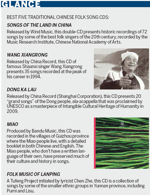 The Ministry of Culture has sponsored Collection of Chinese Folk Songs, a series of anthologies covering over 40,000 folk songs from all over the country. But without accompanying recordings, the books serve little purpose. Folk songs are, after all, sounds.
