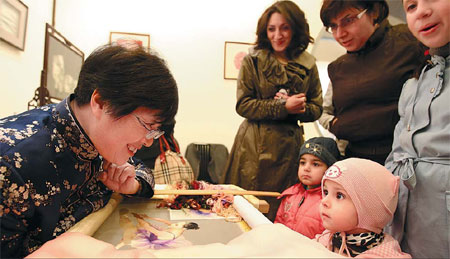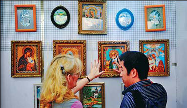 A Russian artist shows her creations to a visitor during a cultural exchange event in Heihe, Heilongjiang province. Wang Jianwei / Xinhua