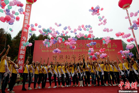 Contestants of 2012 Miss Tourism International attend world peace blessing ceremony held in Tianzhao Mountain Scenic Spot on May 6, 2012. (chinanews.com/Jin Shuo)